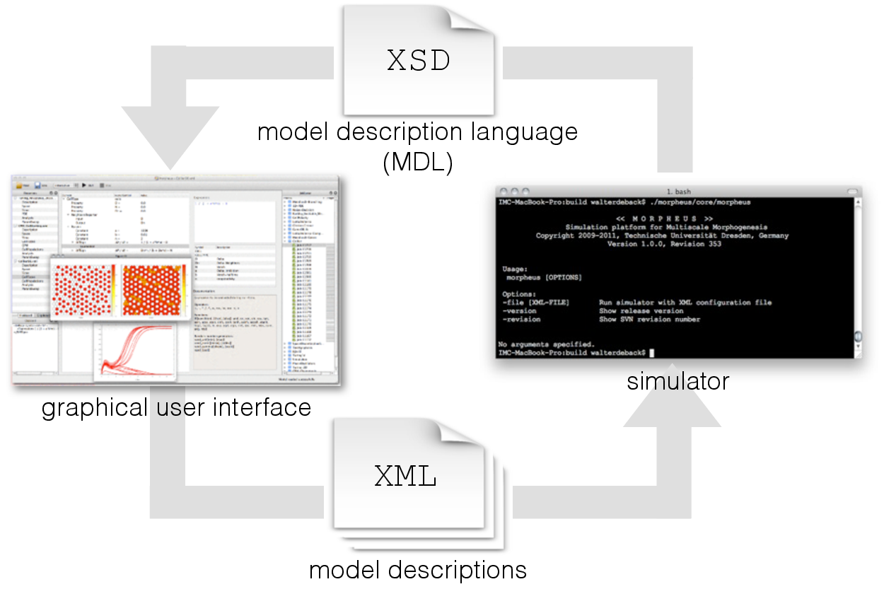 Nevertheless, the XML and XSD files allow for a separation of simulator and the graphical user interface by forming interfaces between the two standalone applications (morpheus and morpheus-gui). (see figure [fig:XML-XSD-1]). During compilation of the simulator, the XSD document describing the MDL is assembled from many small XSD files that specify the rules for each individual part of the simulator. This XSD document is subsequently built into morpheus-gui to use it for editing, as explained above. Upon execution of a model from morpheus-gui, the XML document is written to file, and passed to morpheus as a command line argument.
