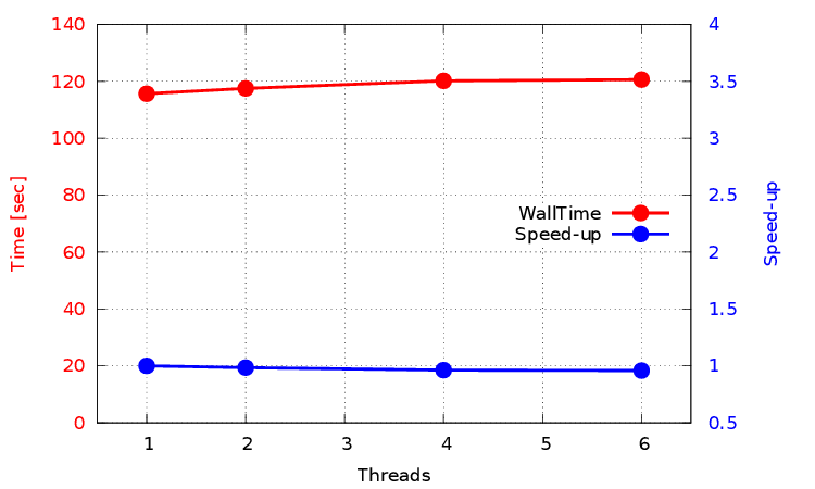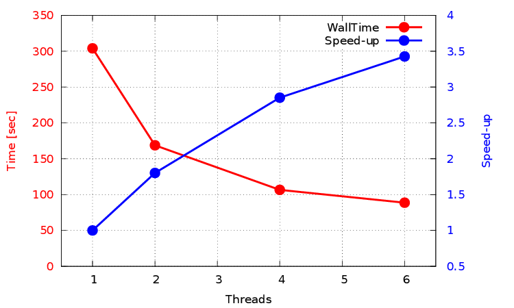 We measured the execution time for each of the simulation run on in 1, 2, 4, 6 threads. Comparison of these execution times shows the speed-ups that can be achieved by adding concurrent threads.