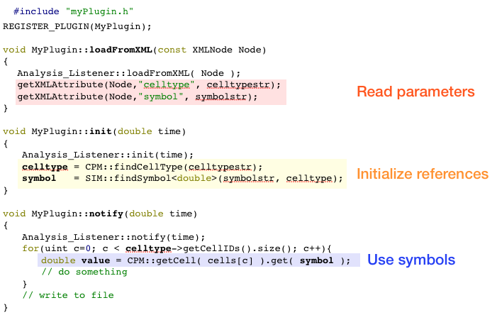 TIFFReader and InitPDEExpression.NeighborsReporter and PDEReporter. Chemotaxis and Persistence. VolumeConstraint and SurfaceConstraint. Gnuplotter and HistogramLogger.Proliferation and InsertMedium. Writing new plugins requires you to add three files: