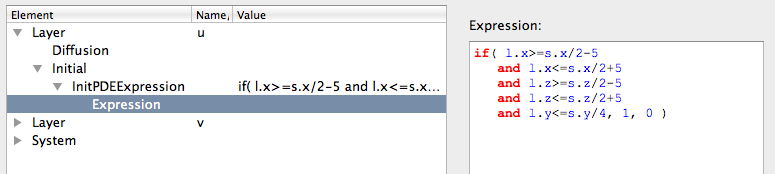 To set an initial condition for a species in the reaction-diffusion model, specify it in PDE → Layer → Initial → InitPDEExpression → Expression.