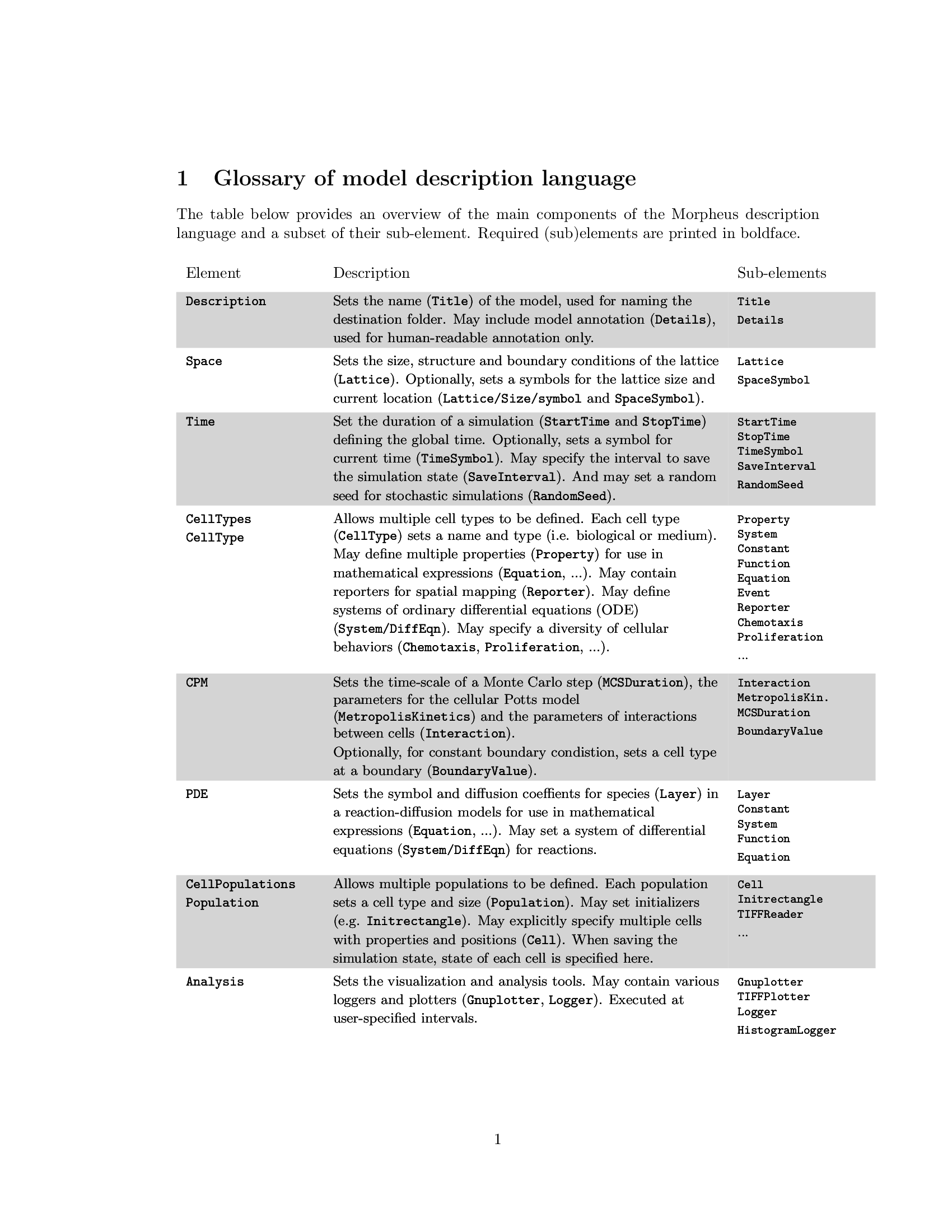 Having multicellular systems biology as its application domain, the choice of biological and mathematical terminology follows naturally. The MDL uses biological concepts such as CellType and Populations to define simulated entities, and concepts such as Proliferation and Chemotaxis to define cellular processes. In addition, the MDL employs mathematical terms such as Equation and Systems of DiffEqn (differential equations) to specify relations and changes of variables. Yet, the inclusion of some computational terms related to the numerical implementation cannot be avoided. For instance, a time-step must be specified for numerical solvers. Moreover, it is of course necessary to specify the duration of simulation and the size or resolution of the simulated domain. The MDL therefore uses a mixture of biological, mathematical and computational terminology. A glossary of the terminology of the Morpheus model description language is available in section [sec:Glossary-of-main].