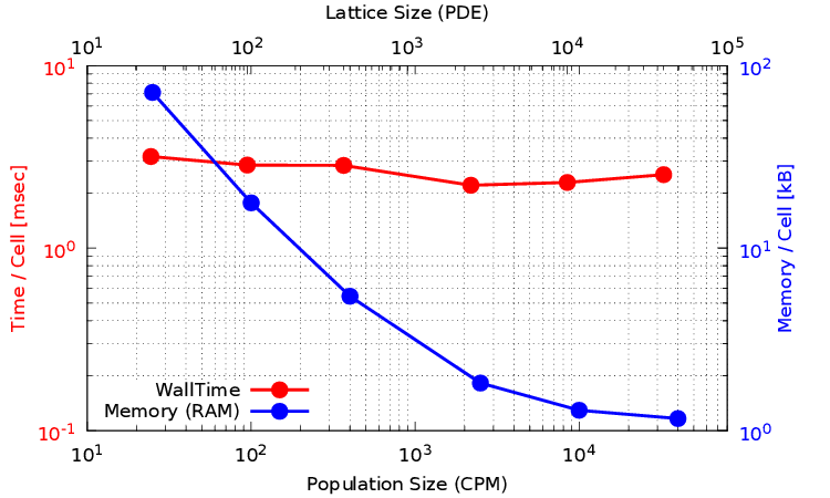NeighborReporters for each cell.Diffusion is only done for large 3D lattices.CPM cells. Small memory footprint, despite edgelist tracking.CPM cell is almost constant, although performance decreases for larger systems. Decrease of memory usage per cell is here mostly due to use of large lattice in all cases.CPM simulations. Therefore, multithreading does not results in speed-up. Instead, the multithreading overhead even slightly decreases performance.