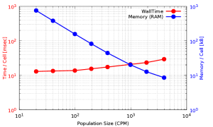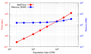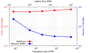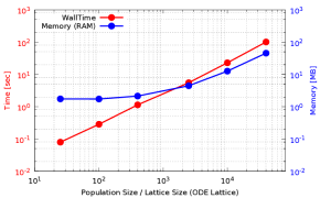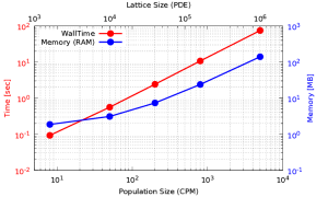 We investigated the scalability with respect to problem size to see how performance in terms of the execution time and memory usage (RAM) scales with increasing population size or lattice size.