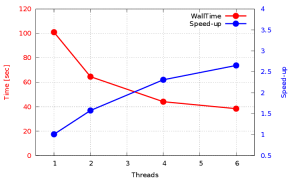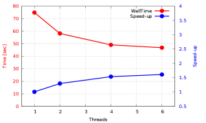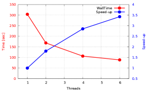 We measured the execution time for each of the simulation run on in 1, 2, 4, 6 threads. Comparison of these execution times shows the speed-ups that can be achieved by adding concurrent threads.