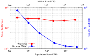 We have tested the performance of ODE lattices, reaction-diffusion (PDE) models, cellular Potts models (CPM) and a multiscale model (CPM+PDE), using the available Example models. The results show the execution time and memory consumption for these models as well as their scalability in terms of problem size and scalability in terms of efficiency of multi-threading.