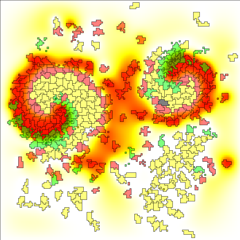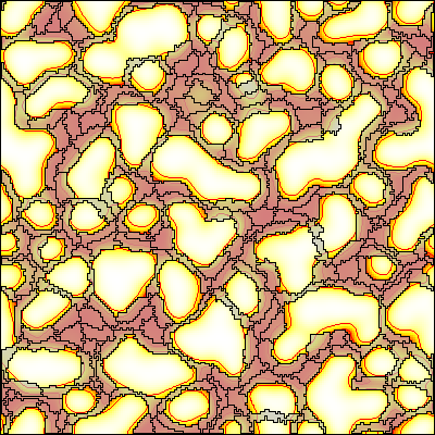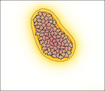 The simulation is visualized using some advances Gnuplotter feature. Cells are superimposed on the PDE and appear as transparent domains (see opacity). Moreover, the concentration gradient of the PDE is emphasized by the use of isolines that draws contours as positions with equal concentration.