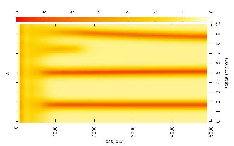Instead of fixed parameters defined as Constants, this model uses Functions for two parameters. The parameters C (activator production) and A (rate of auto-activation) as defined as Function of space and varied over the X- and Y-axes respectively. This requires the definition of a SpaceSymbol that can be used in expressions.